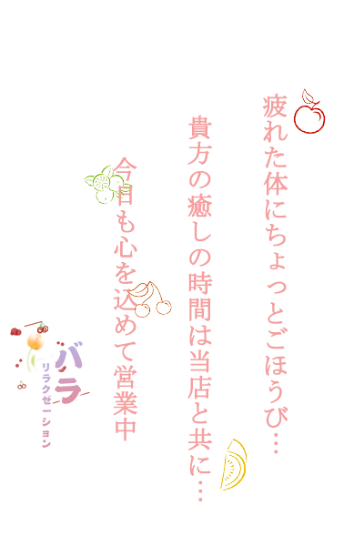 当店は日々忙しいなかでもゆっくりくつろげる空間、癒しの時間を提供いたします。疲れた体を癒し心を楽にします。ストレス社会と言われる現代を勝ち抜くためにも是非ご自分の体のメンテナンスもしてあげて下さいね。皆様のご利用を心よりお待ちしております。